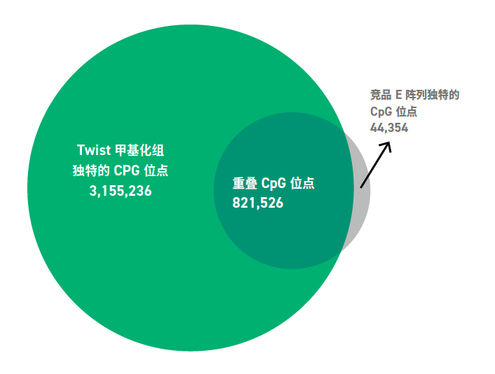 芯片上的设计是静态内容,可能会阻碍新的感兴趣的表观遗传目标的发现。目前市场上的芯片只能有限地覆盖表观基因组中的甲基化组,导致大部分甲基化CpG位点无法被检测。Twist人甲基化组的靶向富集方法通过杂交捕获组合突破了这些限制,该组合通过NGS平台得到的整个测序片段实现更加扩展的内容和单碱基分辨率。