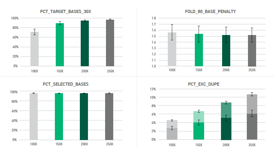 Twist人甲基化组组合经过精心设计和实验室优化,可带来准确、灵敏且高性能的杂交捕获效率。在150x原始覆盖度情况下,该组合可以实现90%以上的靶标碱基达到30x及以上的覆盖度,且中靶率高达95%。通过提高低覆盖区域的覆盖度和降低高覆盖区域的覆盖度,该组合在靶标区域范围内具有高均一性,其Fold 80为1.54。在150x原始覆盖度的高测序深度下,<4%的重复率反向表明了高的文库复杂性。整体的捕获效率指标为甲基化水平的检测带来了高度信心,同时最大限度降低了测序成本。