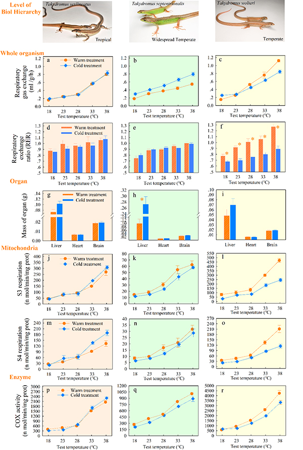 能量代谢作为最重要的生理功能,其温度驯化响应发生在包括代谢酶、细胞,器官系统到整个有机体等多个生物层次。为阐明不同纬度区域的外温动物面对温度变异时的能量代谢驯化响应格局与机制,孙宝珺等研究人员突破了单一层面的传统研究范式,从个体代谢率、组织器官大小、线粒体呼吸、代谢组和蛋白质组等层次研究了能量代谢的温度依赖性及其调控机制,揭示了热带物种南草蜥代谢率的温度驯化响应能力远低于温带物种北草蜥和白条草蜥。