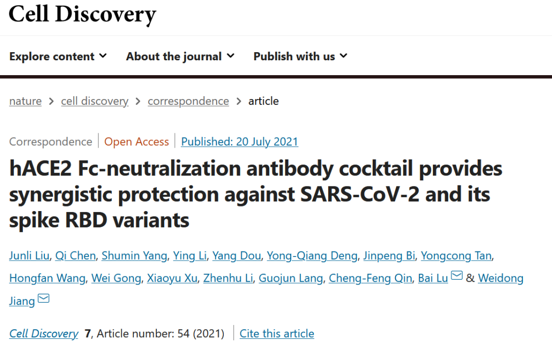 同时,鲁白/豆扬团队与上海复宏汉霖生物技术有限公司创始人姜伟东博士团队合作,探索新冠病毒中和抗体与和ACE2-Fc融合蛋白HLX71联用的疗法。他们发现,基于中和抗体和ACE2-Fc融合蛋白HLX71联用的鸡尾酒疗法,可以有效中和新冠病毒的各种突变株。这一发现为鸡尾酒疗法治疗新冠肺炎提出了一种全新的思路,ACE2-Fc融合蛋白HLX71获得美国食品药品监督管理局(FDA)新药临床试验许可,正在进行治疗新型冠状病毒肺炎临床试验。相关成果发表在Springer Nature集团出版的Cell Discovery期刊上。