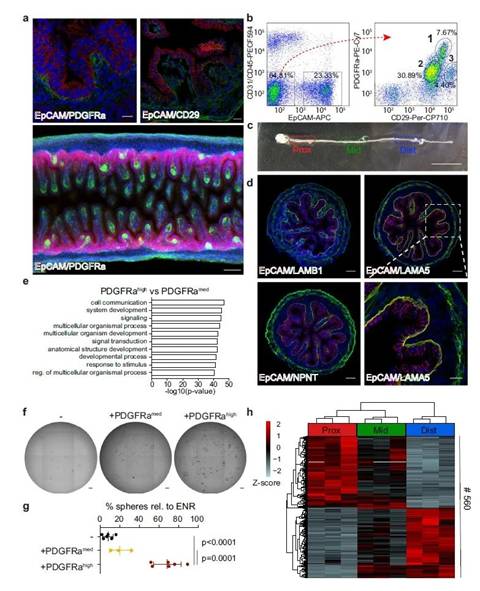 图1. 小肠上皮下 PDGFRahigh 细胞促进小肠上皮细胞的生长并具有区域特异性转录谱。a.免疫组化检测小肠上皮细胞及间充质细胞相对位置。b. DAPI-/CD31-/CD45- 实质细胞根据其 EpCAM(左)和 PDGFRa/CD29(右)参数的细胞分选。c.小肠的前后轴向位置分区。d.在 E16.5 检测 EpCAM(红色)、DAPI(蓝色)和 LAMB1(绿色,左上角)、LAMA5(绿色,右上角和右下角)或 NPNT(绿色,左下角)。e.GO-term 富集分析显示了比较 PDGFRahigh 和 PDGFRamed 细胞的生物过程类别中的前 10 个类别。fg.DAPI-/CD31-/CD45-/EpCAM+ 细胞形成类器官,该细胞分离自 E16.5 SI 的近端 20%,在基础培养基中用 PDGFRamed(中)或无 ENR 的 PDGFRahigh 细胞(右)培养。h.RNA-seq