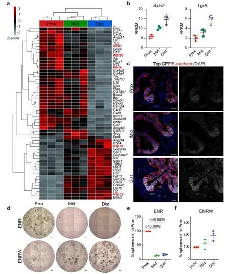 图2. a.远端中,两种典型的Wnt通路激动剂Rspo3和Rspo1高表达,近端中,Wnt拮抗剂Sfrp1和两个非典型Wnt4 wnt6家族成员表达水平更高。b.Wnt两个典型的靶基因Axin2 and Lgr5在小肠远端PDGFRahigh细胞中表达最高。c. 在近端、中部和远端区域检测 Top.CFP(白色)、E-钙粘蛋白(红色)和 DAPI(蓝色)。d-f 从近端、中端和远端区域分离并在 ENR 或 WENR 存在下发育的 DAPI-/CD31-/CD45-/EpCAM+ 细胞形成类器官