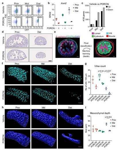 图3.Wnt 信号的变化对小肠转录和结构具有区域特异性影响。a FACS 曲线显示 PORCN 抑制 (PORCNi) 后近端、中部和远端区域 CFP+ 细胞 (DAPI-/CD31-/CD45-/EpCAM+) 的减少。b PORCN 抑制处理与不处理的 Axin2 的 RNA-seq 数据。c RNA-seq 分析显示了对照样本和 PORCNi 样本的近端、中间和远端区域的差异表达基因的数量。d 对照和 PORCNi 样品中近端和远端区域的 H&E 染色。e 机器学习辅助 3D 图像分析的工作流程。f Ilastik 处理的概率图的表面渲染描绘了对照和PORCNi样本中的绒毛。g 对对照样本和PORCNi样品中近端、中间和远端区域的绒毛计数进行量化。h Ilastik 处理的概率图的表面描绘了对照和 PORCNi 样本中的上皮细胞。i 量化对照和 PORCNi 样本中近端、中部和远端区域的间充质深度。