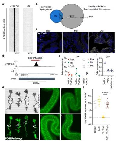 图4. Wnt 信号调节发育中的远端 小肠中的 Shh 表达。a 热图显示在 6238 个已识别的 TCF7L2 结合位点 (±10 kb) 上富集的 ChIP-seq 标签。b Euler图显示了与小肠远端和近端 E16.5 EpCAM+ 细胞相比上调的 385 个基因,与在对照处理中相对于 PORCN 抑制的远端区域下调的 1366 个基因之间的重叠。c 在 E16.5 检测 SHH(白色)和 DAPI(蓝色)。d ChIP-seq轨迹描绘了小肠EpCAM+细胞中MACS1 Shh增强子区域的 TCF7L2 覆盖。e 使用来自 E16.5 胚胎的肠道活检对 Shh 进行 qPCR 分析。f qPCR 分析使用来自 E16.5 小肠远端在 ENR 中培养并用载体5 μM IWP-2 或 10 μM IWR-1-endo 处理 24 小时的已建立的类器官培养物对 Shh 进行 qPCR 分析。g 不同处理后胎儿全肠培养。h PDGFRa+ 簇数的量化。