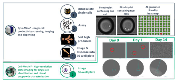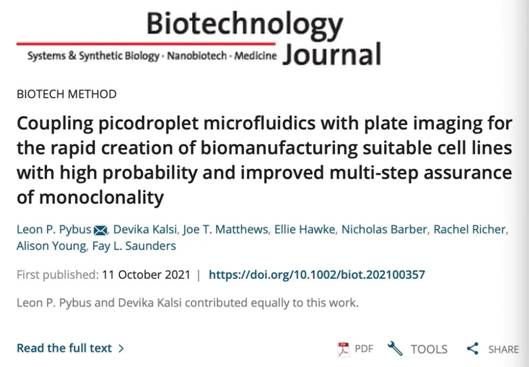 2021年10月Pybus等人发表的文章“Coupling picodroplet microfluidics with plate imaging for the rapid creation of biomanufacturing suitable cell lines with high probability and improved multi-step assurance of monoclonality”使用英国Sphere Fluidics公司的Cyto-Mine®微流控单细胞分析筛选系统结合Solentim公司的Cell Metric®高分辨率孔板成像系统开发出了短时间内产生高产克隆细胞系并保证高概率和单克隆源性的新工作流程。