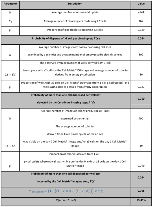 表1. 克隆工作流程的实验得出的P(单克隆)统计数据。正态分布的第95个百分位数(α=0.05;Z1-α=1.645)与威尔逊方法一起用于计算每个单独的误差。显示的数据是十个细胞系开发项目的平均值(9 x mAb 和1 x 非mAb)。