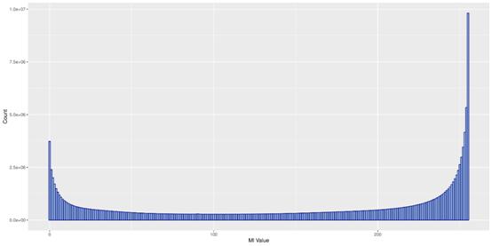 为了解Ml值的实际分布情况,笔者用PacBio公开的HG002个体的HiFi数据集中的一整片Cell的subreads数据,重新用全默认参数运行了ccs和primrose,统计Ml读值,见下图。可见,目前算法产生的Ml值,会在两侧极值周围有比较高的频度。