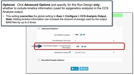 2、若您使用Sequel IIe测序,可在SMRTlink - RunDesign高级设置中开启如下图所示的对应选项,下机数据直接生成ccs文件,直接得到含有kinetics标签的reads.bam。