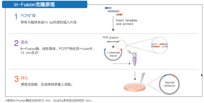 传统克隆方法常存在酶切效率低、多片段及大片段连接效率低、平端连接缺乏方向性、载体自连以及需要亚克隆步骤繁琐等问题。Takara的In-Fusion 技术是一种不依赖连接酶的高效无缝克隆技术,通过识别DNA片段(例如PCR片段和线性化载体)末端15 bp的同源序列来实现高效、准确地融合。仅需15min的反应即可将任意PCR片段克隆到任意目的载体的任意位置,背景低,克隆结果可保证方向性,无需亚克隆,对于50 bp~15 kb的插入片段,克隆效率可超过95%。