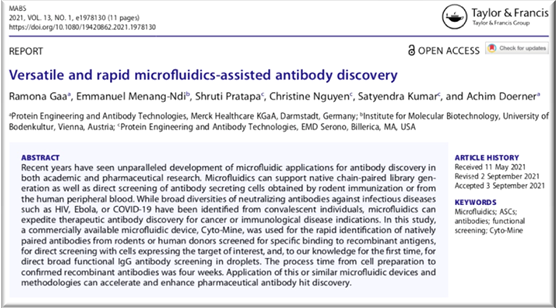 参考文献:Ramona et al. Versatile and rapid microfluidics-assisted antibody discovery. MABS .2021, VOL. 13, NO. 1, e1978130