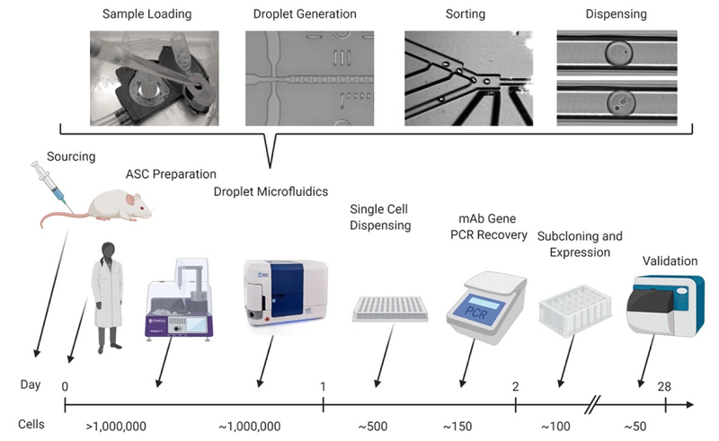 从经过免疫的啮齿类动物或接种疫苗的人浆细胞中可获得Antibody-secreting cells(ASC)即抗体分泌细胞。进行浆细胞富集后,在Cyto-Mine平台上进行上样、包裹产生微滴、根据特异性抗体分泌或功能进行分选、单细胞分配至微孔板。(如Figure1.所示)