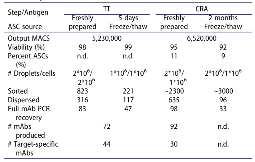 新鲜制备的CD38阳性人浆细胞包裹形成200万个单细胞微滴,冻存5天后的CD38阳性人浆细胞包裹形成100万个单细胞微滴,经Cyto-Mine FRET分析、分选,分别分配了316个以及117个微滴至微孔板,经full mAb PCR recovery、亚克隆以及重组质粒表达和特异性、亲和力测试后,共筛选到一组44个序列多样性以及高亲和力的全人破伤风类毒素抗体panel。Hit rate为10%。