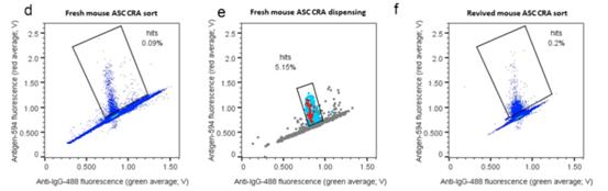 该实验中用到的小鼠浆细胞(来自于免疫了cancer related antigen(CRA)即癌症相关抗原的小鼠骨髓、淋巴结、脾脏)以及人浆细胞(来自于接种了tetanus toxoid (TT)即破伤风类毒素疫苗的健康捐献者外周血)均分别进行了CD138和CD38阳性富集。1百万个细胞重悬在1mL培养基以及检测试剂后上样至Cyto-Cartridge,包裹产生含有单细胞的微滴,37°孵育2-18小时后,在Cyto-Mine平台上进行基于FRET荧光信号分选。分泌人破伤风类毒素抗体的细胞以及表达小鼠癌症相关抗原抗体的细胞分别分配至96孔板。后续进行单细胞mAb gene recovery和subcloning。纯化后的质粒转染至Expi293F 细胞中进行表达,对培养上清进行人破伤风类毒素抗体以及小鼠癌症相关抗原抗体的特异性和亲和力测试。