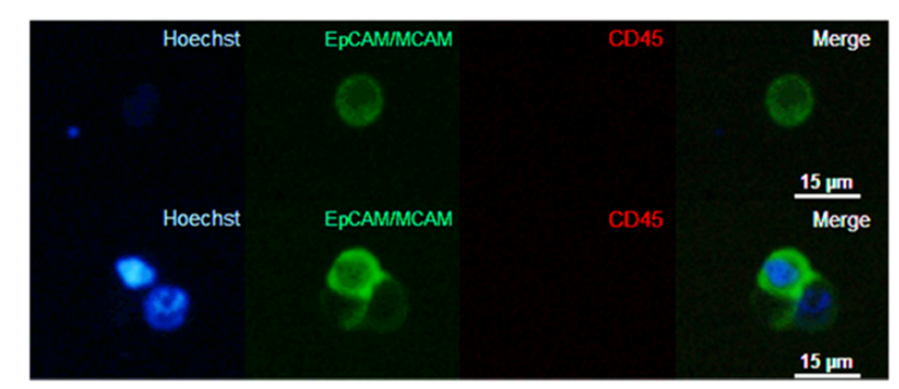 3.对可能的CTC细胞进行荧光染色Hoechst 33342、 antibodies EpCAM-FITC、MCAM-FITC和CD45 DyLight550。