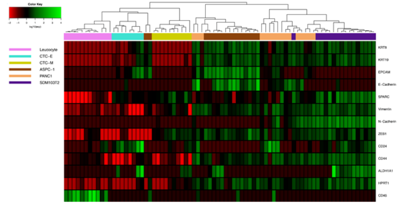 通过聚类分析确定胰腺癌CTCs存在上皮样和间充质样两个亚群。CTC-E细胞markerCD24高表达, CTC-M细胞外间质蛋白SPARC(胰腺癌基因)高表达。这些转录本的差异影响CTC细胞的亚型,很可能与胰腺肿瘤细胞的转移相关。