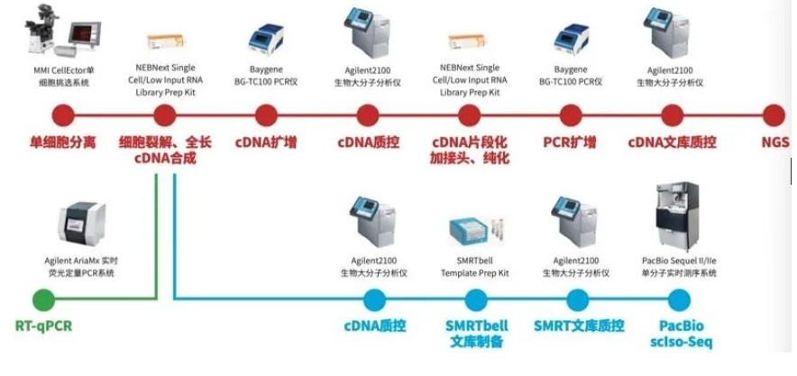 单细胞RNA Seq即单细胞转录组测序,是在单细胞水平上对转录事件进行分析的技术,可以研究单个细胞内的基因表达及可变剪切。NGS是单细胞转录组分析的重要技术基础,NEB已经有单细胞转录组测序的完整方案,即合成单个细胞全长cDNA,并对cDNA进行NGS建库用于NGS转录组测序。但受限于二代测序读长短的问题,转录的可变剪接不能很好的解析。整合全长cDNA的PacBio SMRT建库并进行SMRT测序,单细胞Iso-Seq(scIso-Seq)为解析单个细胞基因转录的可变剪切提供了技术支撑。