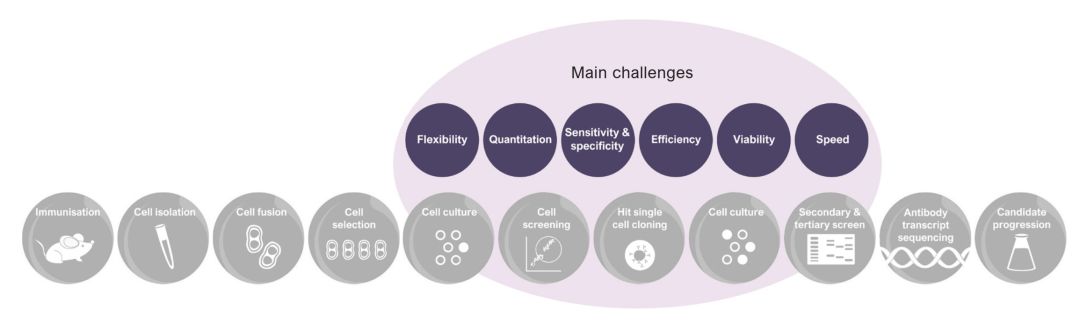 在抗体研发过程中,早期候选物的产生通常始于已知且经过验证的靶标,在该靶标中需要生成候选抗体以进行“命中”选择。传统上,无论是正常动物还是转基因小鼠,大鼠或兔子,都可以免疫动物以刺激免疫反应,几周后可以收集B细胞并将其与骨髓瘤细胞融合形成杂交瘤种群。或者,可以直接分离B细胞,但是无论采用哪种方法,产生抗体的细胞都需要进行广泛的筛选和鉴定。但这一流程使用的常规筛选方法通常会出现流程上的瓶颈: