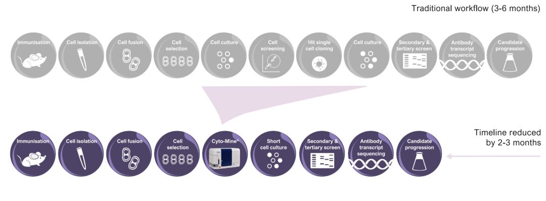 采用Cyto-Mine®平台加速杂交瘤细胞筛选的工作流程,将原来需要3-6个月的研发时间缩短一半