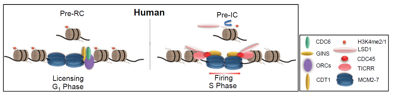 已知DNA复制起始于开放的染色质区域,因此复制起点的选择倾向位于开放状态和活性染色质的调控元件中,如启动子区,增强子区及CpG岛等,然而该研究却发现能够让基因结构变得更为紧密的H3K4me1/2组蛋白去甲基化酶LSD1能够促进复制的进行。LSD1一直被认为存在于CoREST、CtBP和NuRD等多种辅抑制复合物中,并与包括p53在内的多种转录因子相互作用,调控基因转录;LSD1在DNA复制中的作用尚未见报道。该研究表明LSD1(Lysine Specific Demethylase 1)的表达在细胞复制早期达到峰值,并通过促进常染色质增强子区域起始位点的活化和调控复制时间,进而促进DNA复制。H3K4me2是复制前复合物(pre-replication complex,Pre-RC)倾向结合的位点,决定了复制的“许可”,该研究证实LSD1通过去除H3K4me2,促进TICRR(TopBP1-Interacting Checkpoint and Replication Regulator)及随后Cdc45(Cell division cycle 45)的招募,从而使pre-RC转化为起始前复合物,复制起始点被“活化”继而起始复制。LSD1的缺失会导致全基因组复制时序从早期到晚期的转换。综上所述,LSD1在常染色质复制起点的激活和调控复制时序中具有重要作用。