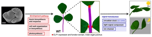 本研究通过对蒺藜苜蓿野生型叶枕及elp1突变体叶枕对应部位的组织进行取材进行转录组和蛋白质组学比较分析,分析结果显示:在叶枕发育和信号转导过程中基因表达和蛋白丰度在多个生物学过程存在极显著的变化。此外,对不同叶组织(叶片、叶枕和叶柄)进行转录组比较分析,为阐明叶枕原基的起始来源和叶片运动的信号通路提供了线索。进一步实验结果显示:生长素合成及信号途径、细胞壁合成和光合作用等相关基因在叶枕发育中起着重要作用。这为精细理解核心转录因子ELP1的功能以及叶运动的机制提供了丰富的数据库,也为后续挖掘叶运动的关键调控因子以及信号转导途径提供了重要的候选基因。