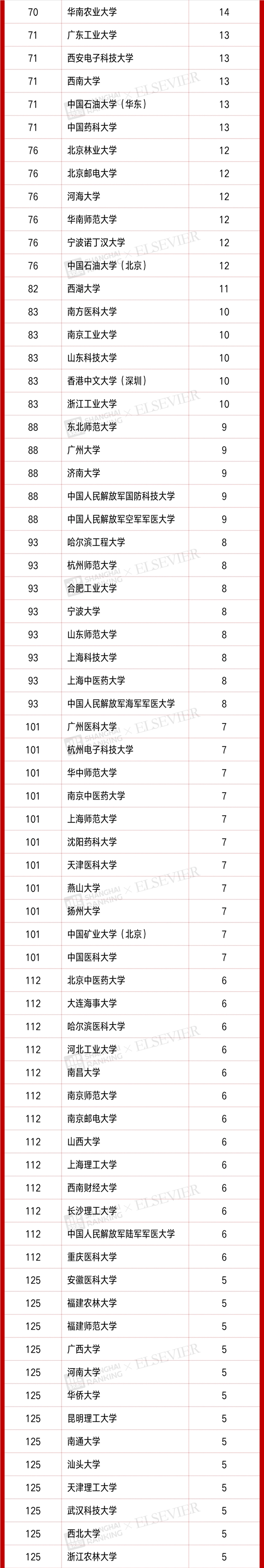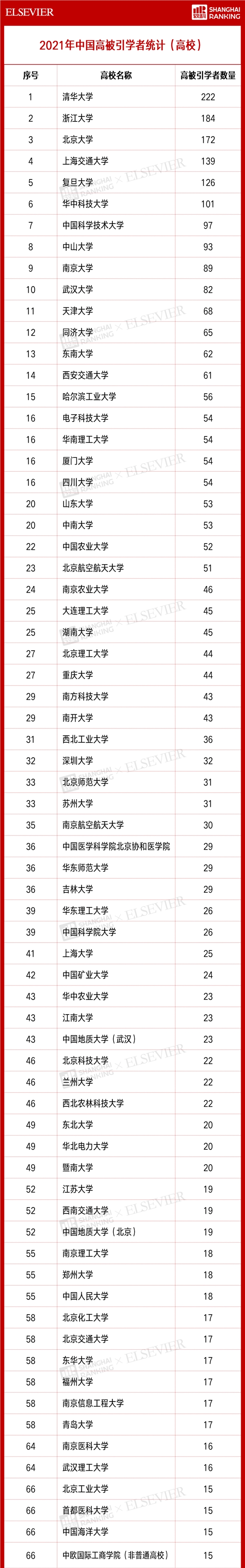 据统计,共319所高校有学者入选,其中6所大学的高被引学者数量超过了100位。清华大学共有222位,位居第一;浙江大学共有184位,位居第二;第三名为北京大学172位;第四、五名分别为上海交通大学139位,复旦大学126位。与去年相比,华中科技大学进步明显,位列第六,入选的高被引学者数量为101位。