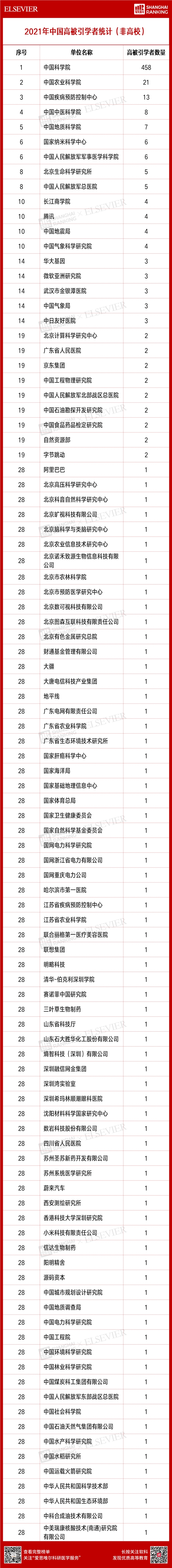 4月14日,全球性信息分析公司爱思唯尔(Elsevier)正式发布了2021“中国高被引学者”(Highly Cited Chinese Researchers)榜单。2021爱思唯尔“中国高被引学者”榜单以全球权威的引文与索引数据库——Scopus作为中国学者科研成果的统计来源,采用软科(上海软科教育信息咨询有限公司)设计的遴选方法,最终得到4701名各学科最具全球影响力的中国学者。