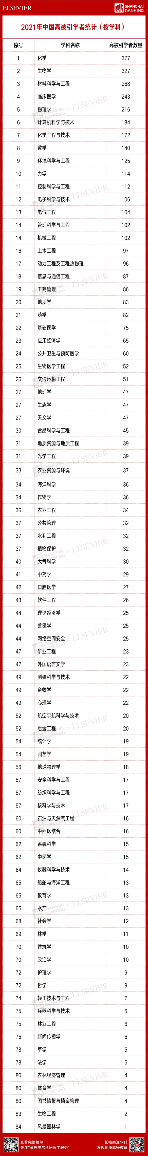 入选的学者共分布在84个不同的学科,其中化学学科高被引学者最多,共377位;生物学、材料科学与工程、临床医学、物理学等学科均超过了200位。