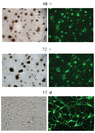 将悬浮培养的mNSC(mouse Neural Stem Cells)细胞贴壁铺板处理,24 h后采用Xfect™ mESC Transfection Reagent(Code No. 631320) 转染pSupper-EGFP质粒。转染后48 h于荧光显微镜下观察转染效率,其转染效率可达80%以上。转染后的mNSC细胞继续培养并进行神经元及神经胶质诱导分化培养,绿色荧光蛋白可持续表达,分化后第12天仍可观察到较强的绿色荧光。"