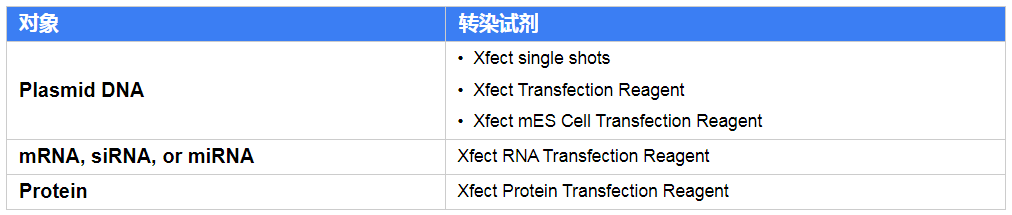 根据转染对象的不同,可以选择专用的Xfect转染试剂。