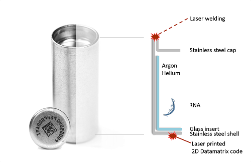 为了延长RNA样品的寿命,Imagene开发出一种存储解决方案,将脱水的RNA样品储存在玻璃管中,并密封在不锈钢“微胶囊”内。这些储存容器中的气体主要是氩气和氦气,而氧气和水的含量低于1 ppm4。直接比较的结果表明,将RNA样品储存在这些微胶囊中的可行性至少与储存在超低温条件下相当。模拟结果还表明,封装的RNA可能在室温下保持稳定长达十年之久。