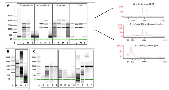 文中作者使用了三种样本裂解方法分别处理四种细菌菌液(B. subtilis–EX,枯草芽孢杆菌;B. subtilis – SP,枯草芽孢杆菌内孢子;金黄色葡萄球菌,大肠杆菌)、猪粪便的样本以及蠓并提取RNA,使用安捷伦2100片段分析仪对RNA 质控结果如图1所示:使用CryoPrep™系统、冷冻研磨以及TissueLyser分别处理四种菌液,CryoPrep™或冷冻研磨可以观察到清晰的核糖体RNA小亚基和大亚基条带,RNA 质量较高,枯草芽孢杆菌中CryoPrep™系统得到的RNA降解最少(图1A);对于猪粪便样本来说,无论是使用冷冻研磨还是TissueLyser,都会造成核酸的降解,CryoPrep™系统处理,RNA基本无降解(图1B);以蠓为样本提取的核酸,CryoPrep™和TissueLyser表现最佳,核酸的降解较少(图1C)。