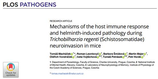 [1]Macha´ček T, Leontovyč R, Sˇmı´dova´ B, Majer M, Vondra´ček O, Vojtěchova´ I, et al. (2022) Mechanisms of the host immune response and helminth-induced pathology during Trichobilharzia regenti (Schistosomatidae) neuroinvasion in mice. PLoS Pathog 18(2): e1010302. https://doi.org/10.1371/journal.ppat.1010302