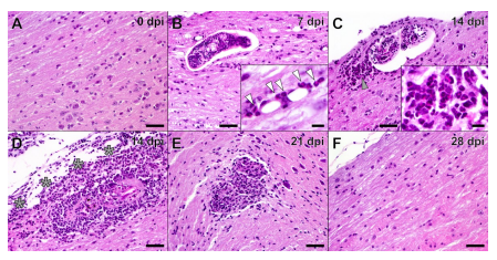 图4. 毛毕吸虫感染脊髓前后不同时间段的组织学检测。