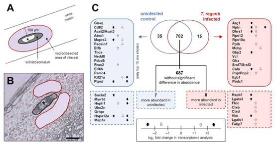 图8.毛毕吸虫脊髓组织的蛋白质组学分析。(A)感兴趣区域的示意图;(B) 激光显微切割捕获寄生虫周围100μm内的小鼠脊髓组织;(C)激光显微切割神经组织的蛋白质组学分析总结。