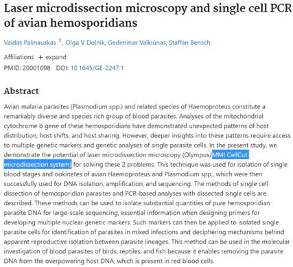 [2] Palinauskas V, Dolnik OV, Valkiūnas G, Bensch S. Laser microdissection microscopy and single cell PCR of avian hemosporidians. J Parasitol. 2010 Apr;96(2):420-4. doi: 10.1645/GE-2247.1. PMID: 20001098.