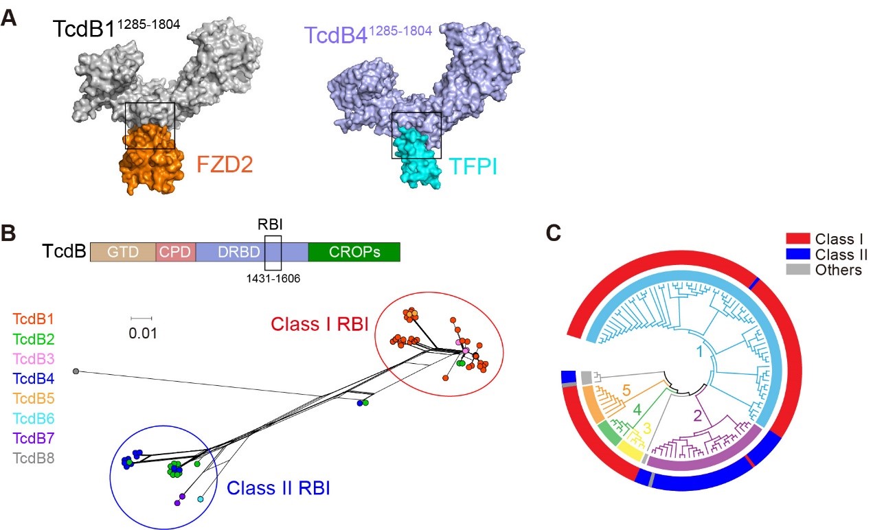 (A) 毒素-受体复合物TcdB1-FZD2与TcdB4-TFPI的结构比较。(B) 系统进化分析发现TcdB基于受体结合区域差异可分为两大类,分别识别FZD和TFPI。(C) 艰难梭菌分支I、III、IV、V的TcdB识别FZD作为受体,超毒力分支II的TcdB识别TFPI作为受体。