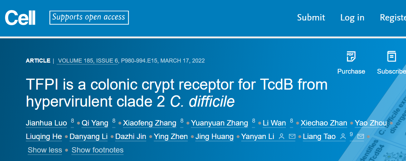 北京时间2022年3月17日23点,西湖大学生命科学学院陶亮团队与施一公团队合作,在《细胞》(Cell)在线发表题为“TFPI is a colonic crypt receptor for TcdB from hypervirulent clade 2 C. difficile”的最新研究成果,首次揭示了超毒力分支艰难梭菌毒素B的肠道上皮受体——TFPI蛋白。