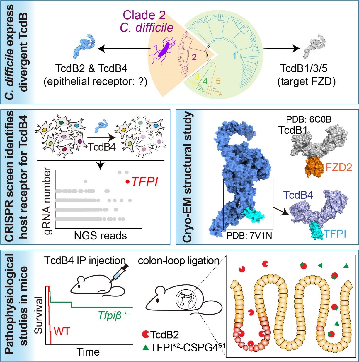 利用一种名为CRISPR/Cas9的基因敲除文库筛选技术,陶亮团队排查出了一系列相关的候选因子,即“怀疑对象”。经过分析后,他们锁定了一个名为组织因子途径抑制因子(TFPI)的蛋白,认为这个存在于细胞表面的蛋白“涉案”可能性最大,很可能就是这两种毒素B变体进入细胞的“另一扇门”。