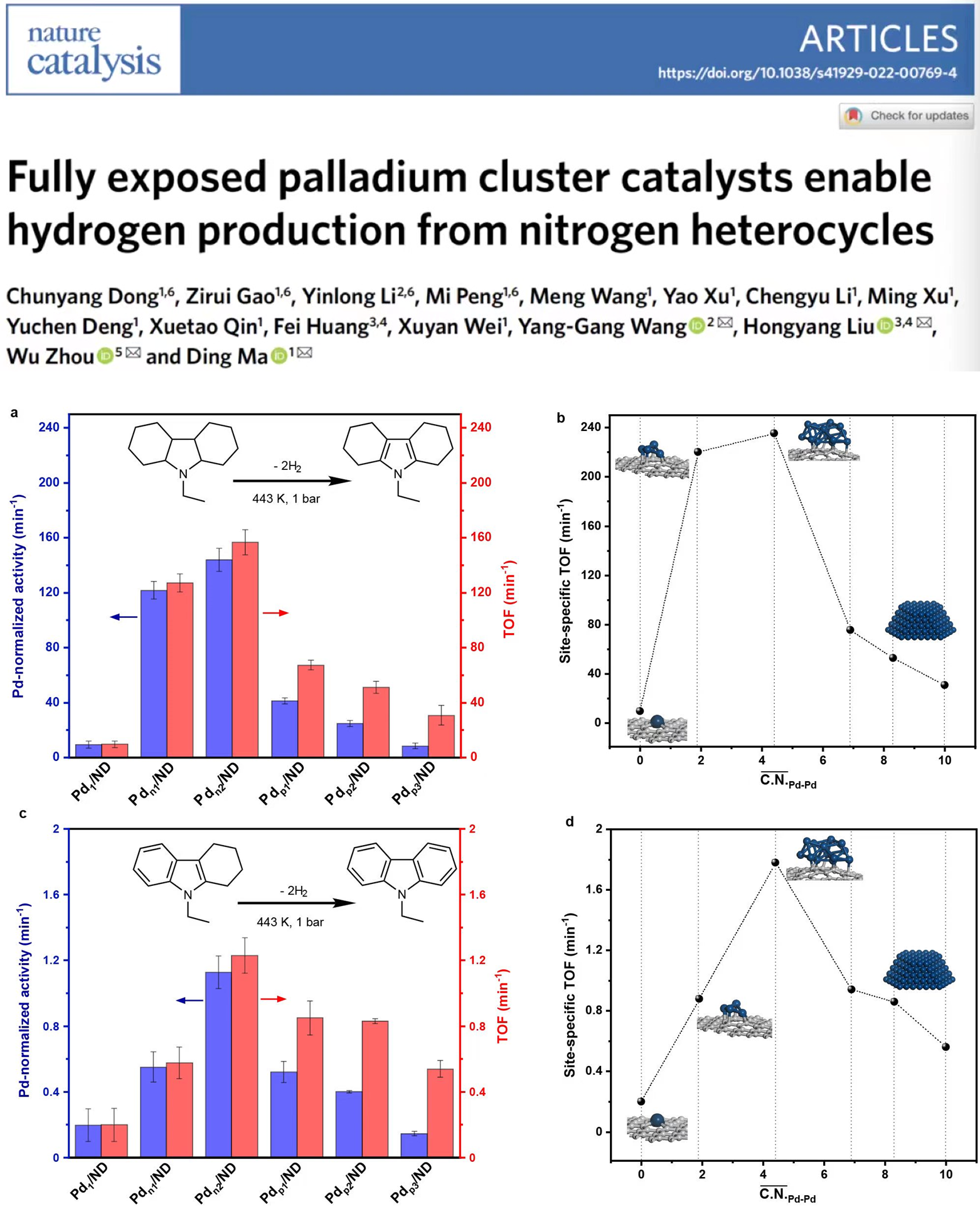 图1. 用于12H-N-乙基咔唑脱氢过程的Pd FECC,兼具超高金属利用率和理想的金属电子性质从而展示出优异活性(Nat.Catal. doi: 10.1038/s41929-022-00769-4)