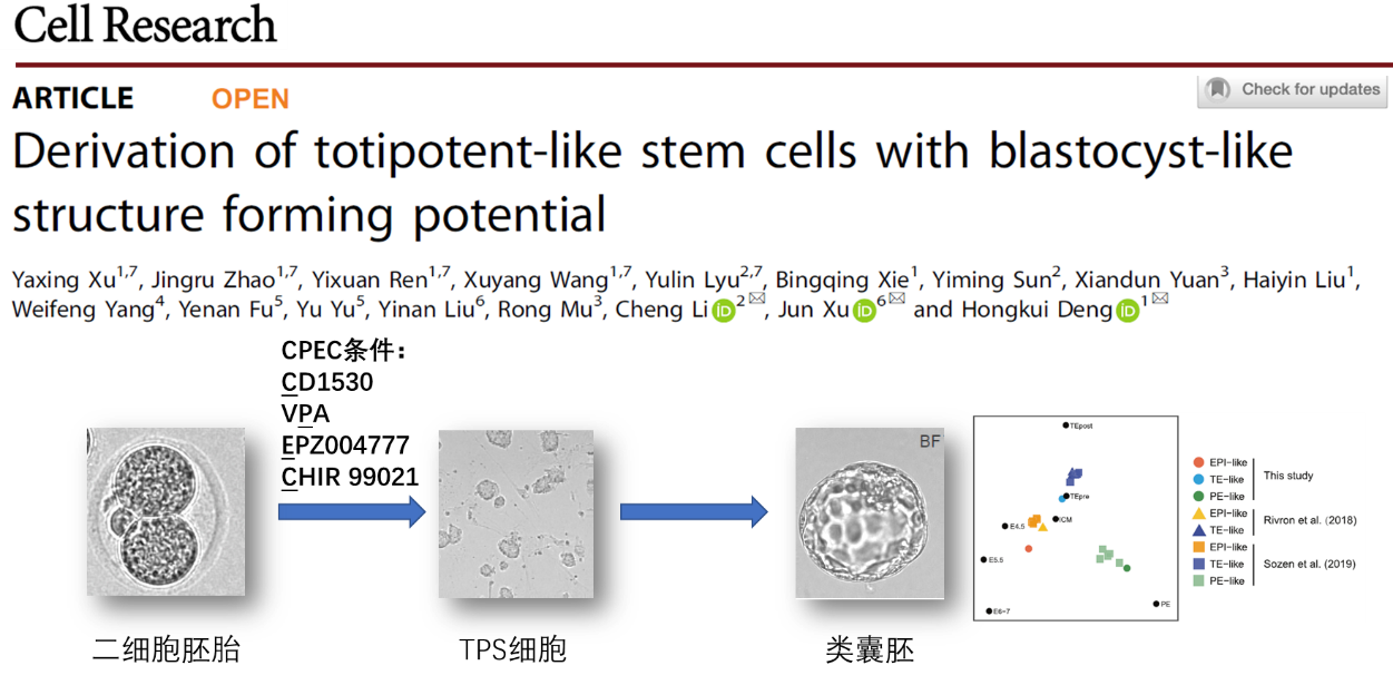 2022年5月4日,北京大学医学部基础医学院干细胞研究中心徐君课题组和邓宏魁课题组合作,在Cell Research杂志上发表了题为“Derivation of totipotent-like stem cells with blastocyst-like structure forming potential”的研究论文