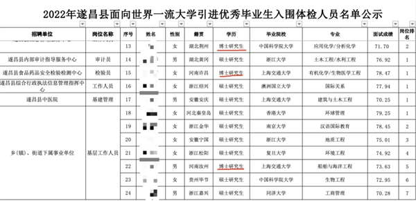 这番解释与上述公示名单相吻合。记者看到,24名一流高校的优秀毕业生中,除7 位硕博士生(6位硕士、1位博士)将入职乡(镇)、街道下属事业单位外,其余17位的工作岗位均须具备一定的相关专业技能。例如,遂昌县食品药品安全检验检测中心招聘的是检验员岗位,对应的待入职的张博士,是上海交通大学有机化学/生物医学工程专业毕业生。