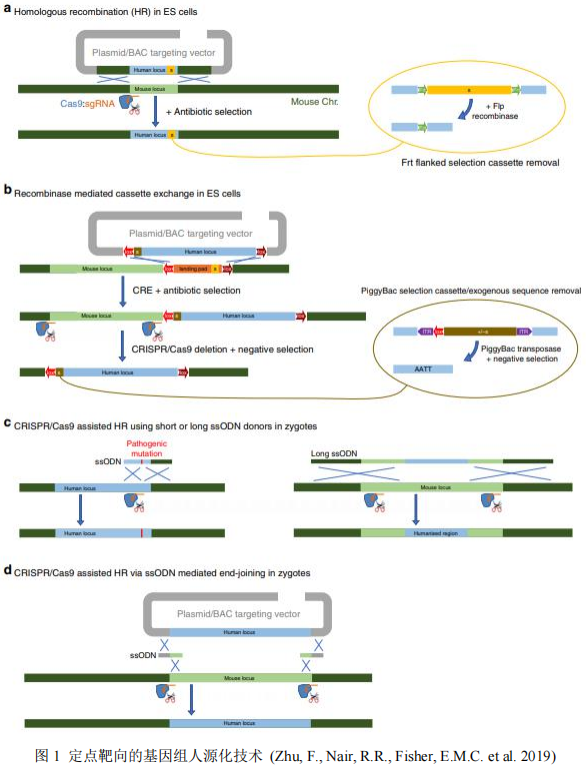 a. 运用 ES 细胞中进行的 HR 可以将高达~200kb 的基因座进行人源化(重复使用可以人源化更大的基因组片段)。通过电穿孔将携带人类基因组序列以及同源臂的质粒或 BAC 靶向载体转染到 ES 细胞中;同时转染 Cas9:sgRNA 可以产生特定的双链断裂,从而提高 HR 效率;之后,运用抗性基因选择标记可以筛选包含所需的重组的细胞。筛选标记的两侧通常是 frt 位点, 可利用 FLP 重组酶切除后会留下 frt 痕迹。