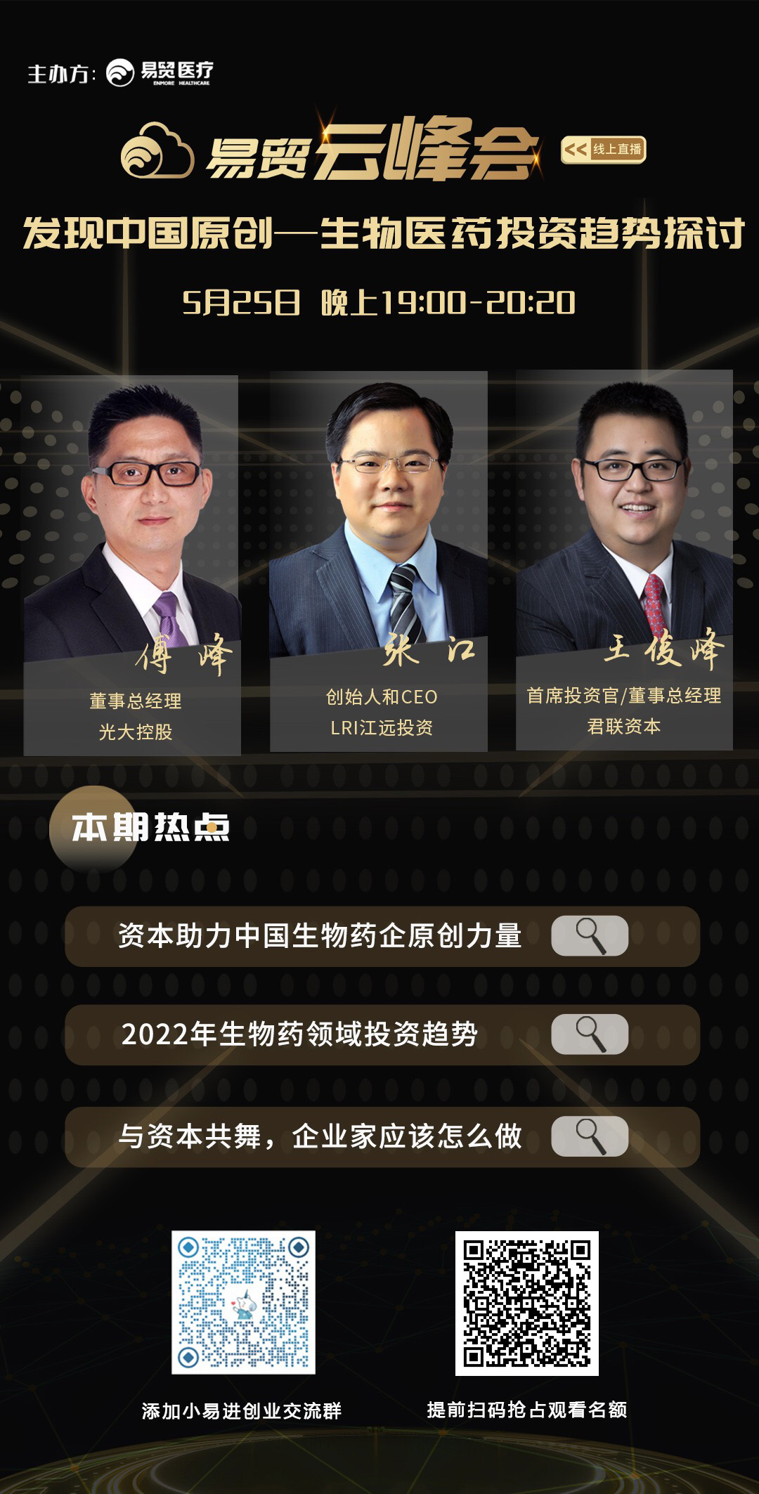 5月25日晚间19:00,光大控股董事总经理傅峰先生,LRI江远投资创始人兼CEO张江先生,君联资本联席首席投资官兼董事总经理王俊峰先生,首次联合做客易贸医疗【云峰会】直播间,与大家一起发现中国原创,探讨生物医药投资趋势。
