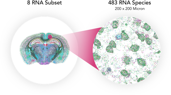 目前存在三种主要的方法对大块组织进行空间探索,并旨在以单细胞或亚细胞分辨率以及转录组规模进行。一种是基于MERFISH( Multiplexed error-robust fluorescence in situ hybridization)技术,通过组合标记、超分辨多轮顺序成像的方法实现成百上千种转录本的检测,精准定位每个基因的每个转录本在组织中的表达并对其进行定量,目前已经有商品化平台(Vizgen公司MERSCOPE™超分辨显微成像分析平台)。
