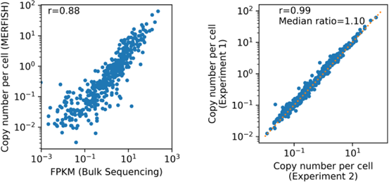 4. MERFISH结果高度可重复。使用MERSCOPE平台得出的结果与bulk-seq基因表达定量结果一致性好。脑切片之间的结果具有高度可重复性。