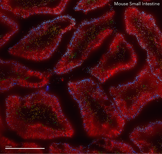 2. 检测到其它空间转录组学技术可能漏检的低表达GPCR基因,如Oxtr、Tshr和Insr 。100nm的空间分辨率不仅可以看到每个转录本在1cm²组织上的空间分布,还能看到在每个细胞内的分布。