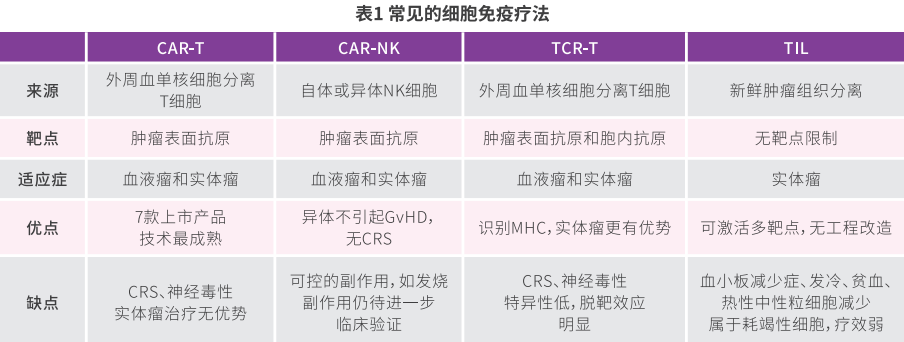 广义上的细胞疗法分为两种,一是将体内的细胞在体外增殖、扩充,再回输至患者的体内,利用细胞自身的分化能 力或可溶性因子分泌的能力,恢复先前受损或恶化的组织和器官结构,例如干细胞移植、肿瘤浸润细胞(TIL)治疗等。二是将体内的干细胞或免疫细胞在体外进行工程化处理,赋予细胞额外的功能,用来修复组织、器官缺陷,例如对造血干 细胞进行基因修饰,治疗β-地中海贫血症;或者用来对抗各种肿瘤,例如CAR-T、CAR-NK、 TCR-T等细胞疗法。