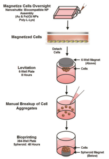 人类间充质干细胞(hMSCs)具有多能性,能够分化为多种细胞系(包括脂肪细胞、软骨细胞和骨细胞),从多能型hMSCs到最终目标细胞系(如软骨细胞)的完全分化通常需要14 - 28天。由于需要每2到3天更换一次培养基,人工操作不仅繁琐,而且在处理非附着细胞时,会增加意外清除球体的风险。若将处理步骤自动化,并结合3D磁性生物打印方法,可以使研究人员自由地执行其他实验,并增加可重复性,几乎没有球体损失的风险。