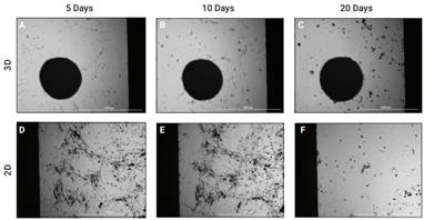 在自动培养基更换期间,通过Cytation 5明场成像确认换液过程中细胞和3D球体的完整性(图3),3D细胞在20天的孵育过程中保持完整,而2D细胞最长可培养10天,在10天后可见明显的细胞损失,该结果也证实了之前的研究,即2D培养的细胞在孵育10天后会失去完整性和活力。