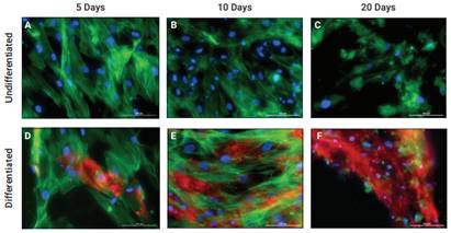通过比较在分化培养基中培养的细胞和在生长培养基中未分化的细胞,检测2D培养细胞的软骨细胞分化。如图4所示,软骨细胞在孵育5天内开始分化,并在10天迅速达到顶峰,而在生长培养基中培养的细胞则没有分化;10天后,2D培养的细胞全部丧失活力,在分化的细胞中,胶原II荧光探针浸出到周围的培养基中。这也证实了2D分化的hMSCs在长期研究中的局限性。